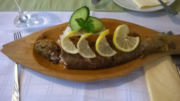 A választék nehéz feladat elé állít. Míg várakozunk a halk szavú kiszolgáló hölgy egy ízelítő tállal kínál meg bennünket. Megérkezik az illatozó, gőzölgő marhahús leves, kiváló nyitánya egy pazar ebédnek. Ezt követi az egybensült pisztráng, mandulás rizzsel. Ízorgia a tányéron.