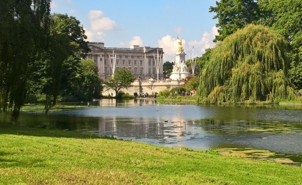 Csak megyünk a turista áradat után. Hömpölyögnek az emberek, biztosan jó helyen járunk. Az út két oldalán a már megszokott jól ápolt szép park, teleszórva színes nyugágyakkal, a megfáradt vándorok részére. De még kora délelőtt van, így csak üresen süttetik magukat. Megvan a magyarázat miért ez az ember-tömeg. Mindjárt kezdődik az “őrség váltás”. Esélyünk sincs még a közelébe se menni. De a gyönyörű palota magáért beszél. Hatalmas, impozáns. Ez jelenleg a brit uralkodó II. Erzsébet királynő rezidenciája. A palota 1837 óta szolgálja az uralkodó családot. A Buckingham-palota egyike a világ legismertebb épületeinek. Évente mintegy 50 000 látogatót fogad. Sajnos ebbe mi nem számítunk bele.